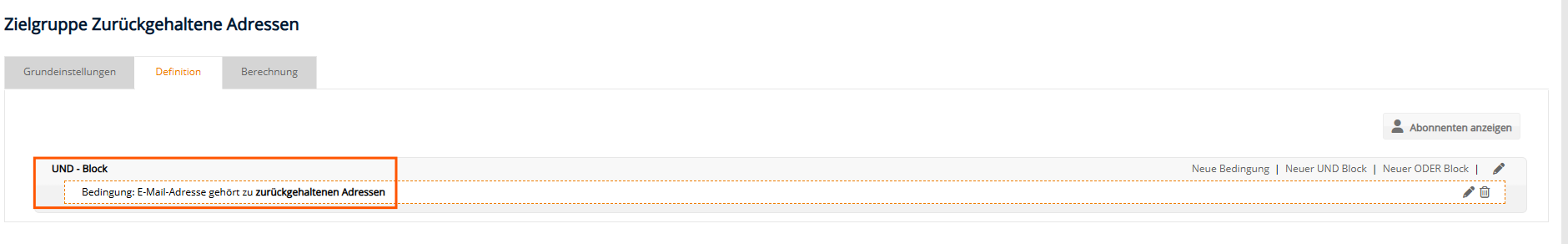 Zielgruppe, die so definiert ist, dass diese nur die Abonnenten anzeigt, welche sich auf der zurückgehaltenen Adressenliste befinden. Erstelle dazu in der Übersicht der Zielgruppen eine neue Zielgruppe über den Button „Erstellen" und gib ihr einen aussagekräftigen Namen. Anschließend wählst du unter dem Reiter „Definition" die Bedingung „