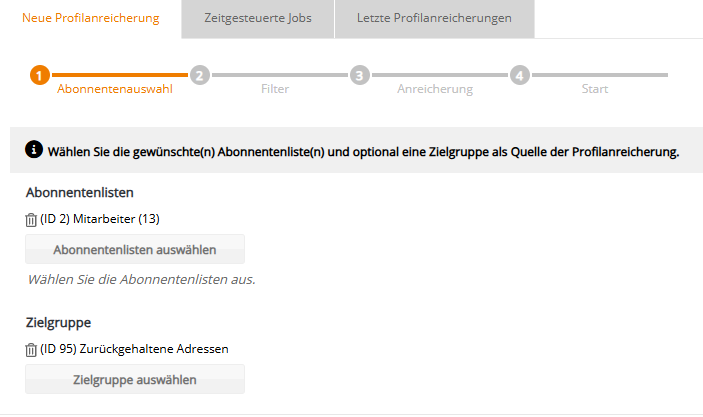 Im nächsten Schritt öffnest du unter Abonnenten > Profilanreicherung das Profilanreicherungsmodul und erstellst eine neue Profilanreicherung.