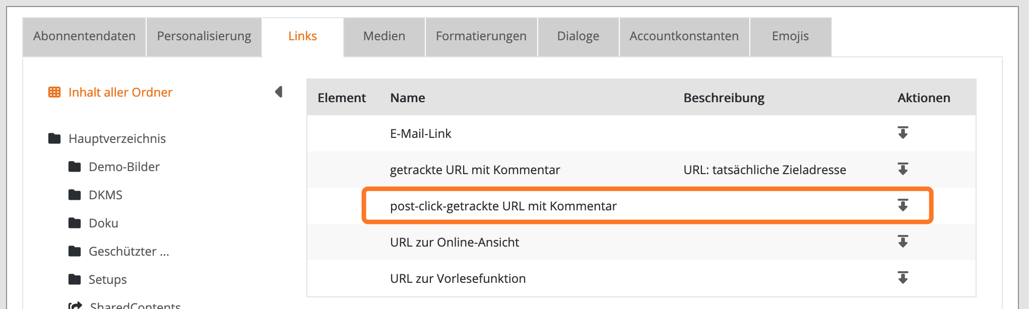 Wechsle zum Tab Links und fügen den Platzhalter über die Option post-click-getrackte URL mit Kommentar ein .