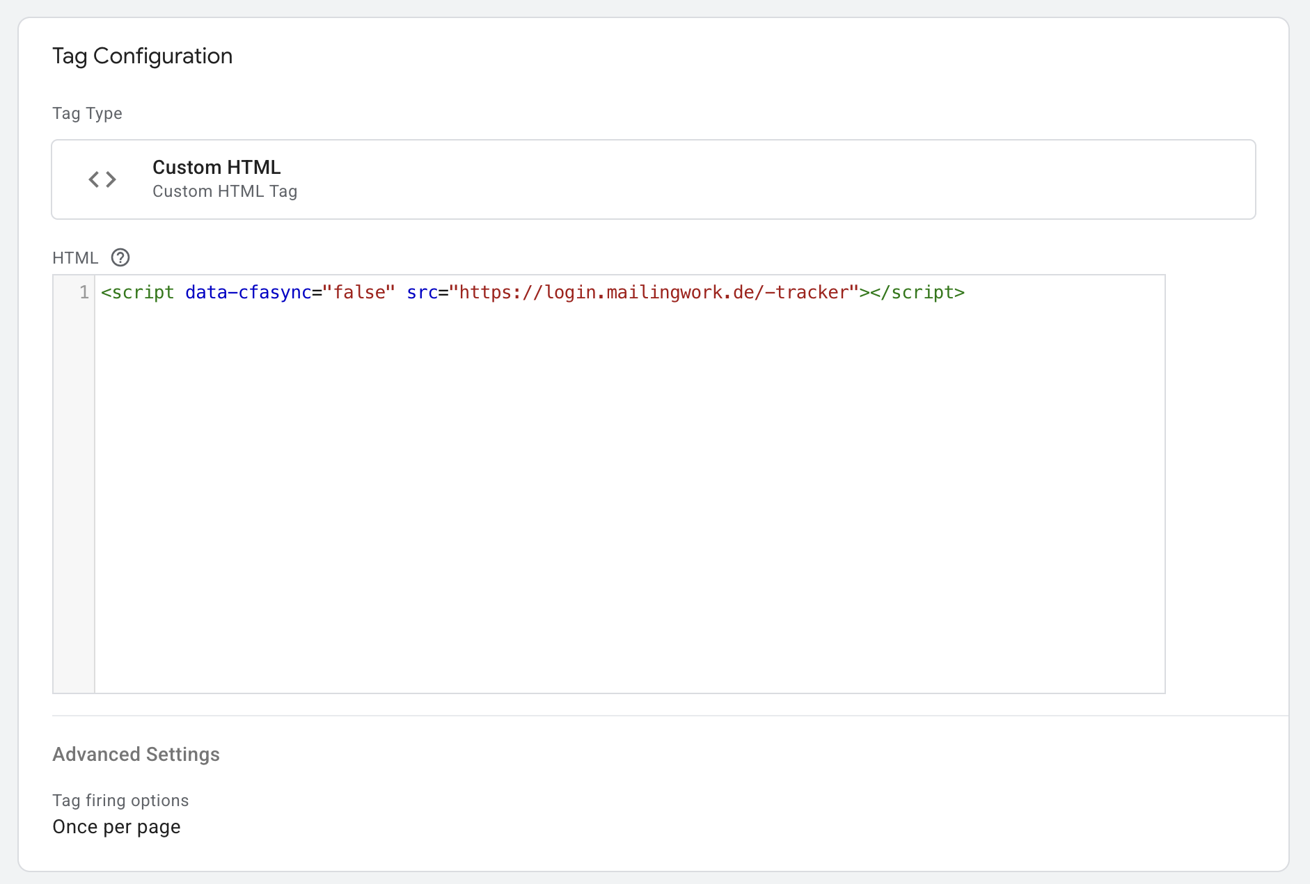 - Setze unter Advanced Settings die Tag Firing Options auf Once per page.