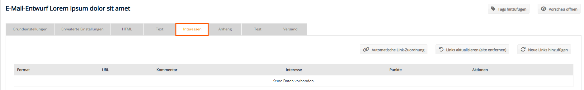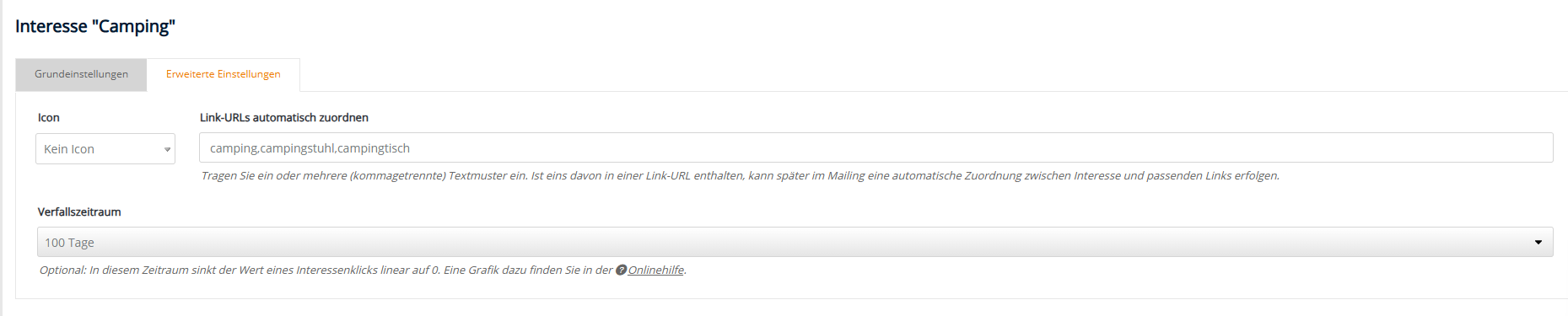 Ein praktisches Beispiel: Wenn du einen Link wie "https://www.shop.de/camping/zelte" in deinem Mailing verwendest und "camping" als Textmuster hinterlegt hast, wird dieser Link automatisch dem entsprechenden Interesse zugeordnet. Das spart dir viel manuelle Arbeit, besonders wenn du regelmäßig Newsletter mit vielen Links versendest.