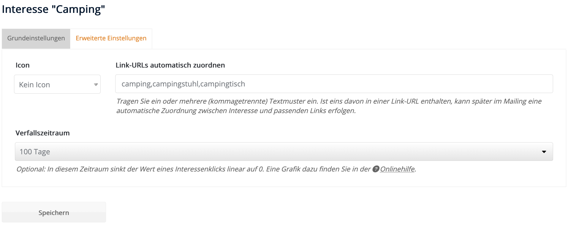 Nutze unbedingt die Funktion der automatischen Link-Zuordnung. Definiere Textmuster für wiederkehrende URL-Strukturen, um Zeit zu sparen und sicherzustellen, dass kein relevanter Link vergessen wird. Alternativ kannst du auch innerhalb des Interessenstabs in deinem Mailing die URLs manuell einem Interesse zuordnen. Verwende einen angemessenen Verfallszeitraum – für die meisten Anwendungsfälle sind 100 bis 365 Tage ausreichend. Markiere alle relevanten Links in deinen Mailings mit Interessen, denn je mehr Datenpunkte du sammelst, desto präziser wird das Interessenprofil.