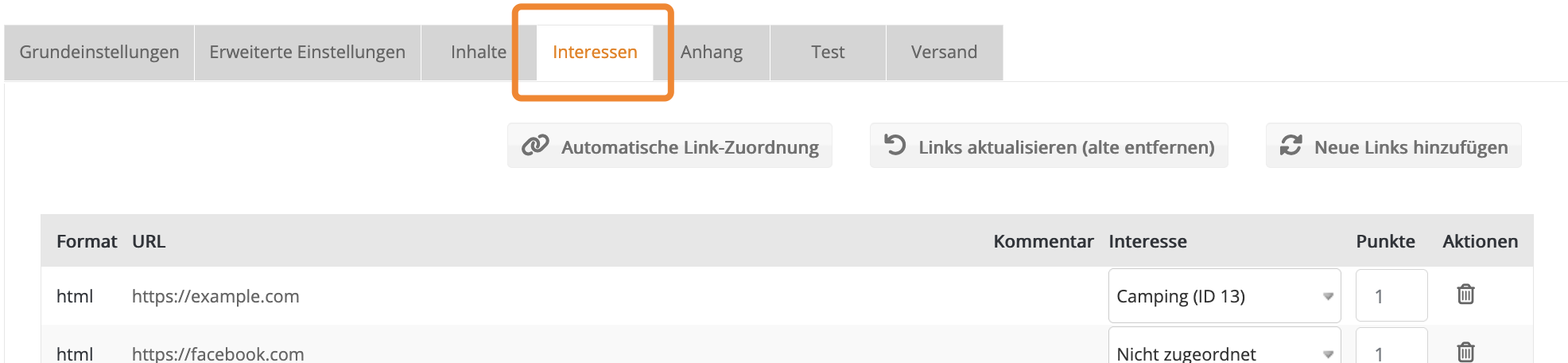 Nachdem du deine Interessen angelegt hast, ordnest du im Mailing über den Reiter Interessen jedem relevanten Link das entsprechende Interesse zu. Dies funktioniert auf zwei Arten: Entweder wählst du manuell für jeden Link das passende Interesse aus der Liste aus, oder du nutzt die automatische Zuordnung, falls du Textmuster für die URL-Zuordnung hinterlegt hast. Die automatische Variante spart dir erheblich Zeit, besonders bei Newslettern mit vielen Links.