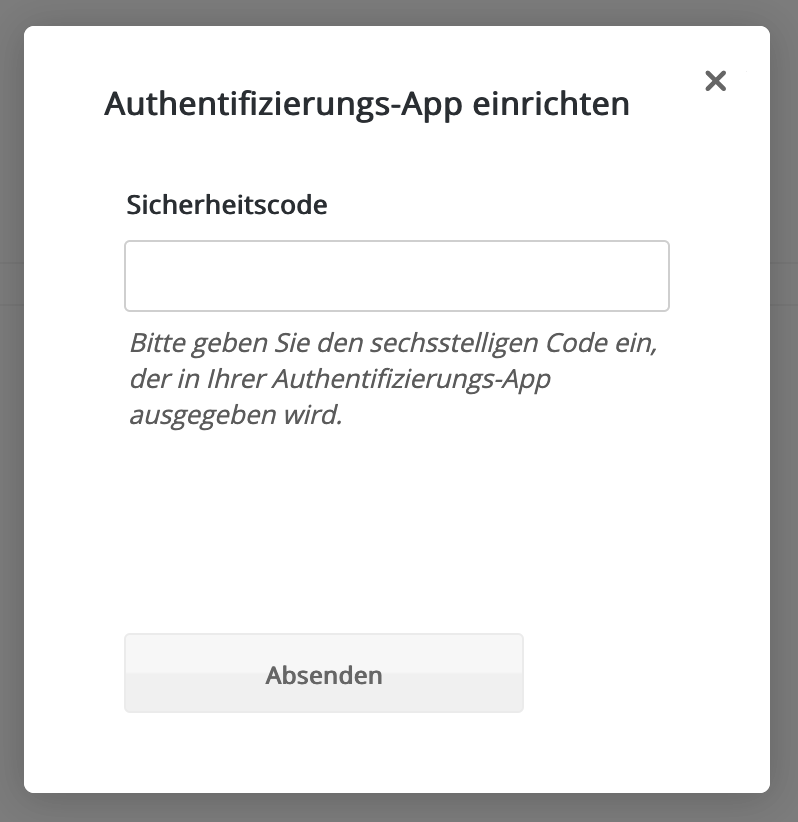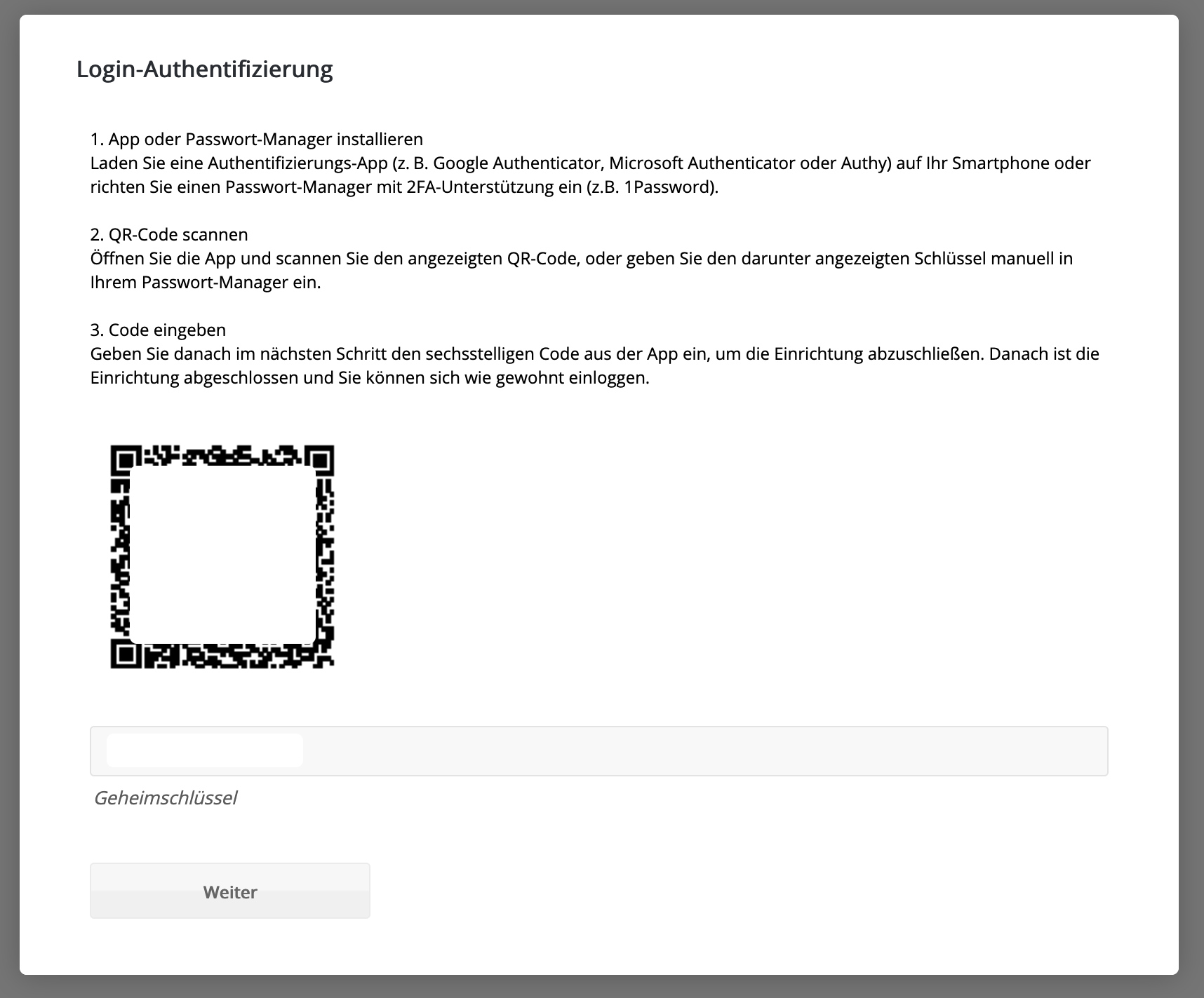 Falls du Login-Code via Authentifizierungs-App gewählt hast, erhältst du den zum Einrichten notwendigen QR-Code bzw. Geheimschlüssel.