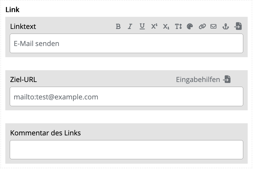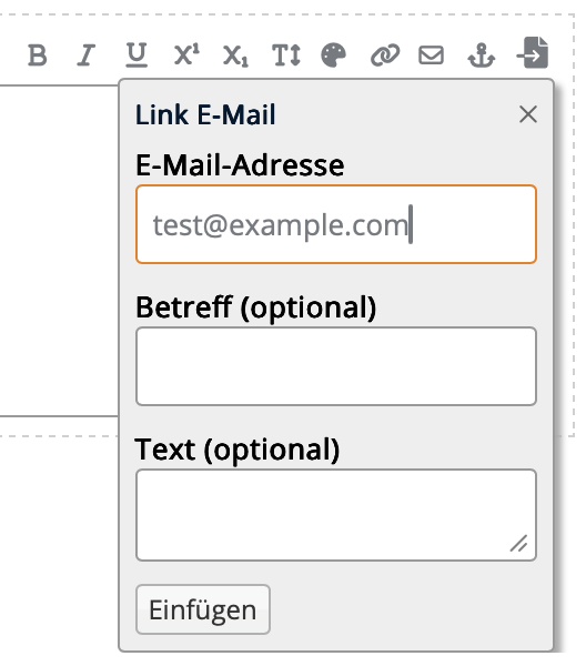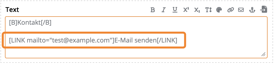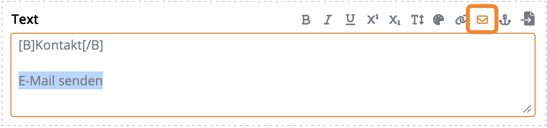 Innerhalb von Fließtexten lassen sich Mailto-Links über die Eingabehilfen einfügen. Markiere den zu verlinkenden Text und Klicke auf das E-Mail-Icon.
