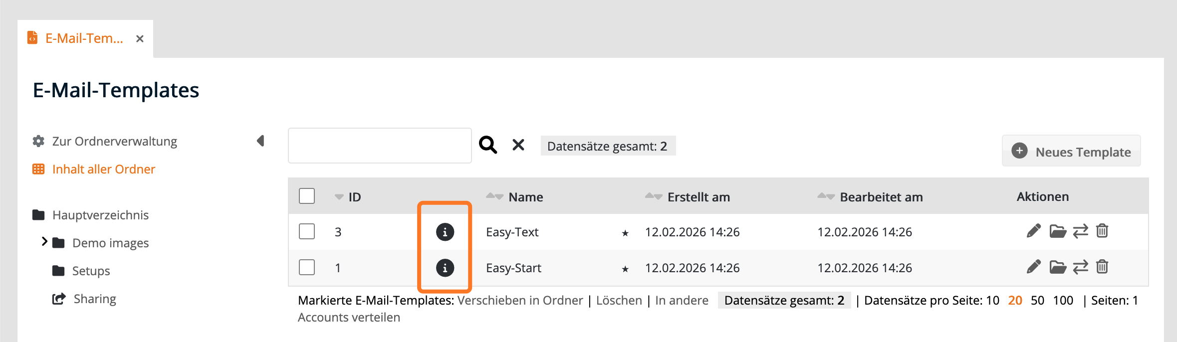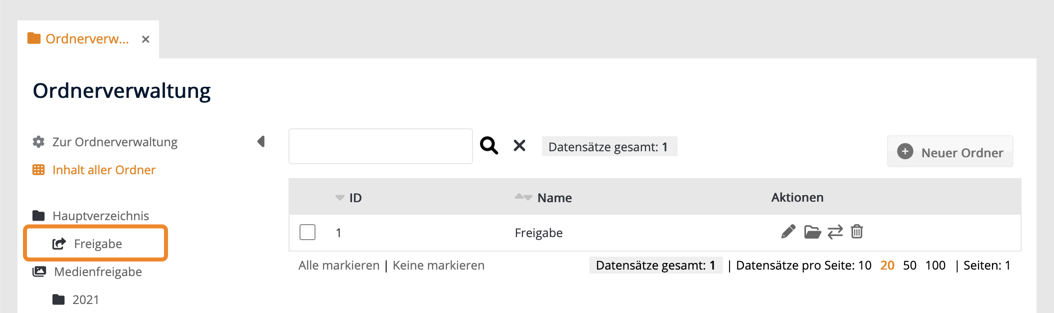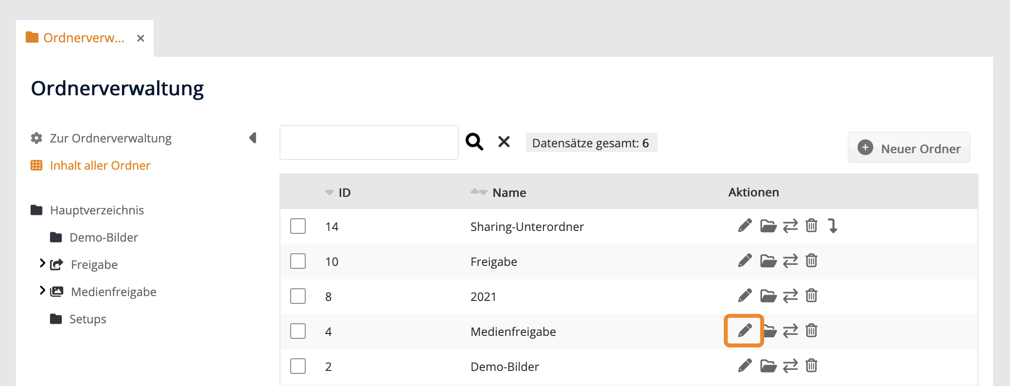Logge dich zum Erstellen der Medienfreigabe in den Master-Account ein und gehe zu "Administration" > "Ordnerverwaltung". Erstelle bei Bedarf einen neuen Ordner. Klicke in der Spalte Aktionen auf das Bearbeiten-Icon.