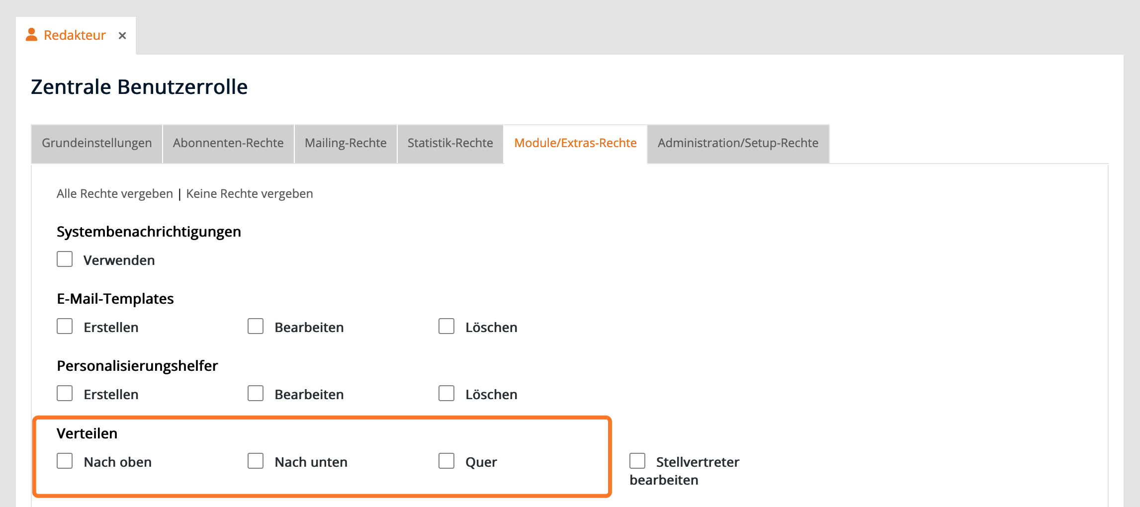 Benutzerrolle kann festgelegt werden, ob und in welche Richtung Inhalte verteilt werden dürfen.