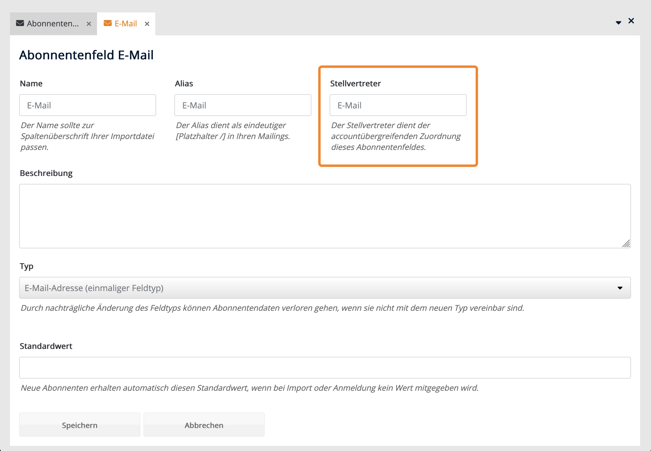 Der Stellvertreter ist ein Identifikator zur accountübergreifenden Zuordnung von Elementen wie Abonnentenfeldern, Setups oder Listen. Er darf aus Buchstaben, Zahlen und Unterstrichen bestehen.