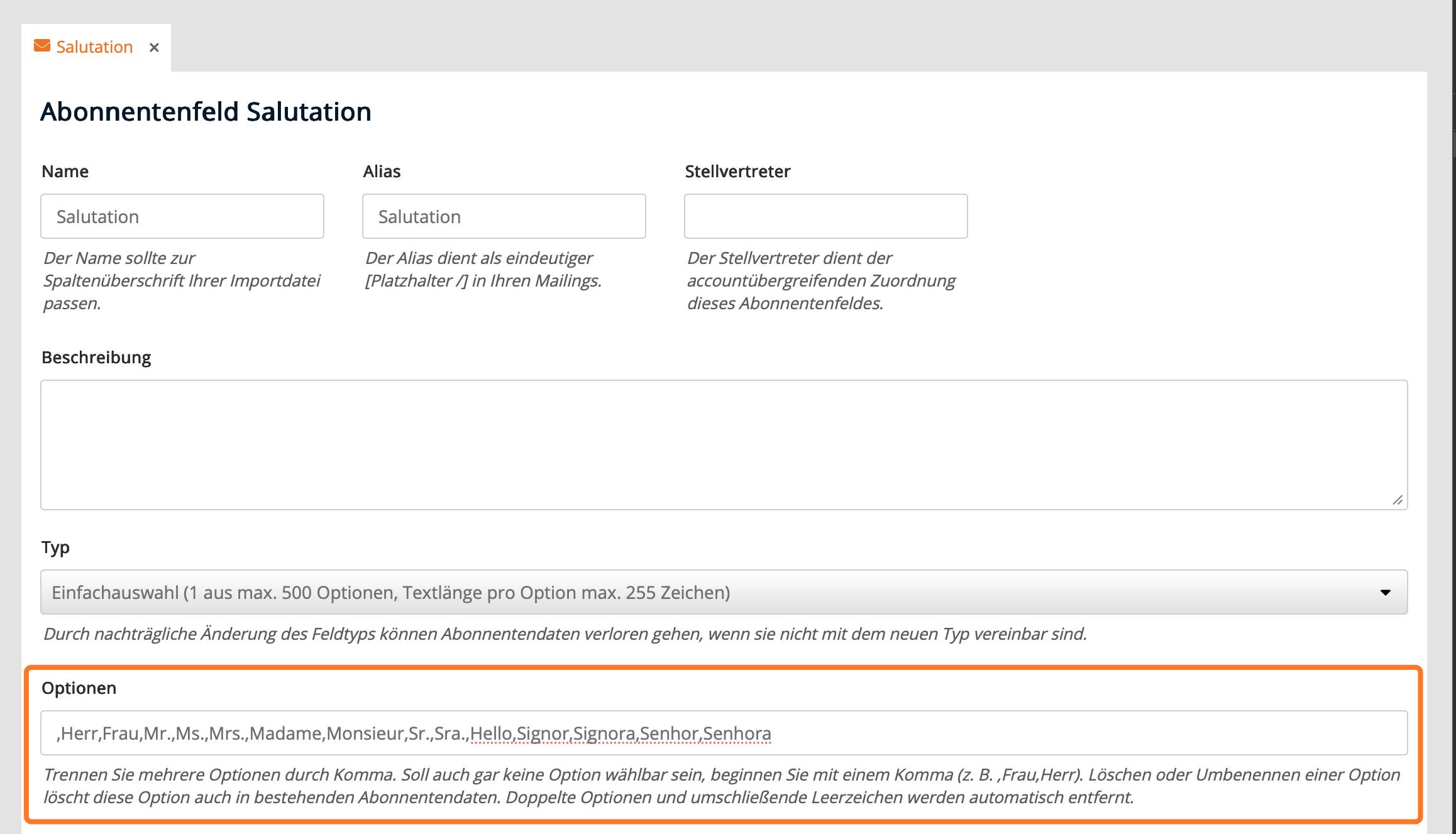 - Lege im Master-Account ein Feld "Anrede" an (falls noch nicht vorhanden).