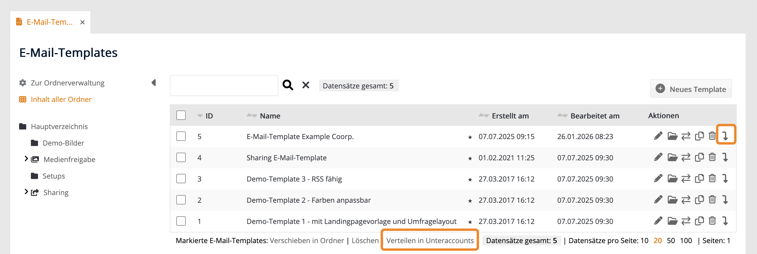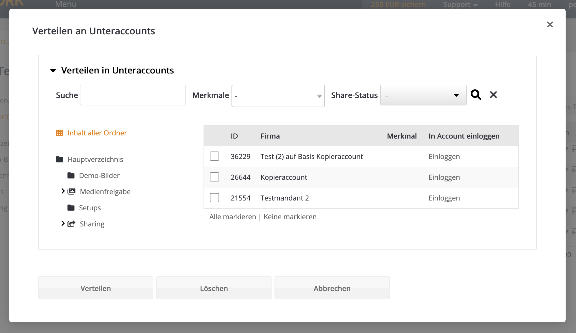 - Über die Mehrfachaktion "Verteilen in Unteraccounts" (unterhalb der Tabelle)