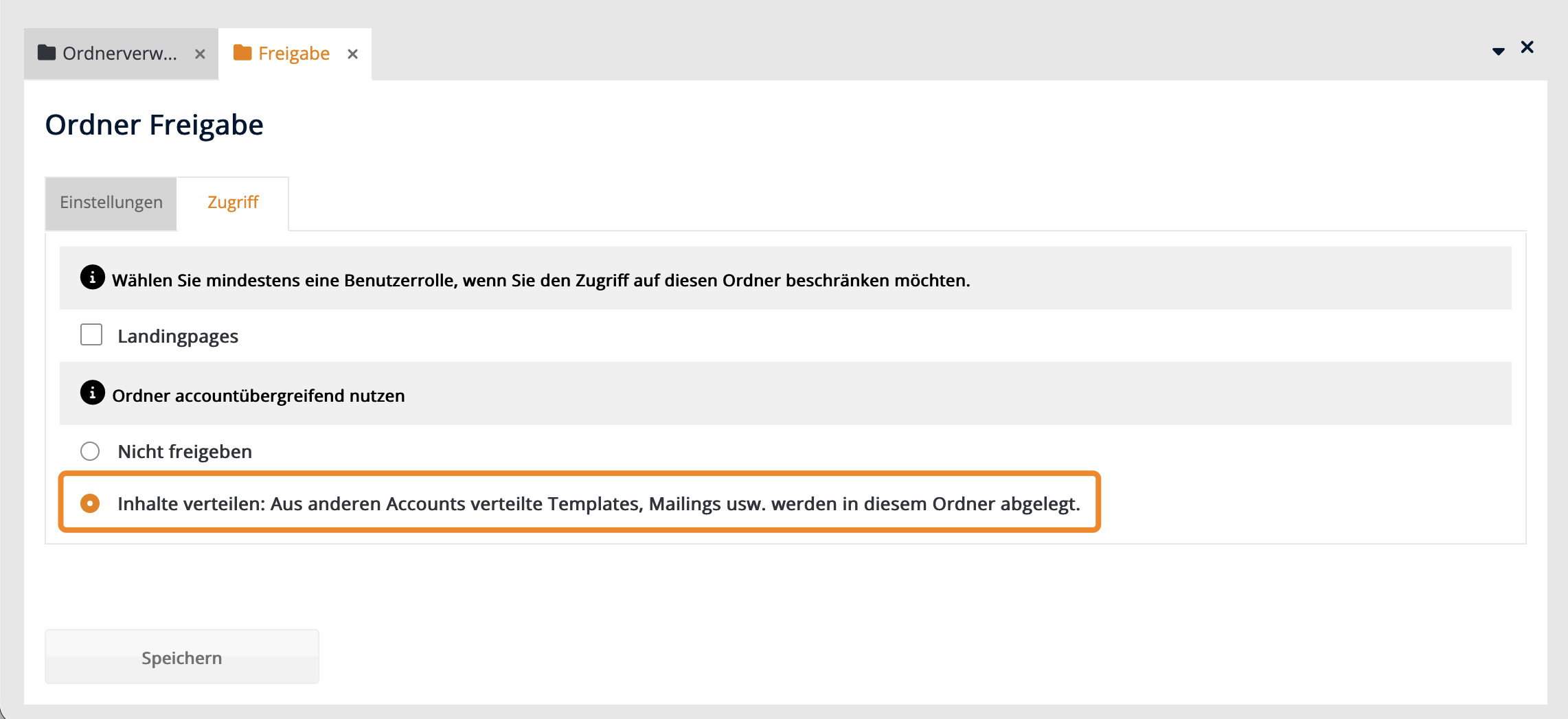 Wähle im Tab "Zugriff" die Option "Inhalte verteilen" an und klicke anschließend unten auf den Button "Speichern".