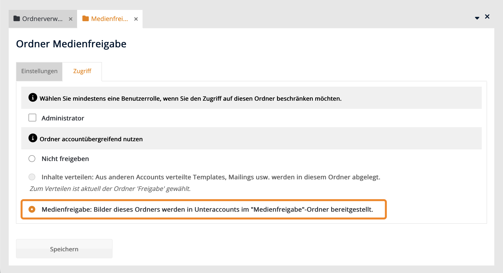 Um in einen Account Elemente verteilen zu können, muss in diesem ein Freigabeordner vorhanden sein. Logge dich zum Erstellen eines Freigabeordners in den gewünschten Sub-Account ein. Öffne Administration > Ordnerverwaltung.