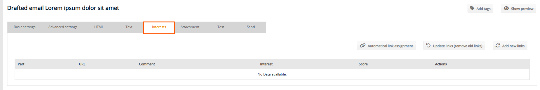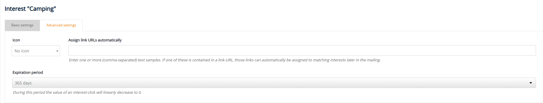 Be sure to use the automatic link assignment function. Define text patterns for recurring URL structures to save time and ensure that no relevant link is forgotten. Alternatively, you can also manually assign URLs to an interest within the interests tab in your mailing. Use an appropriate decay period – for most use cases, 100 to 365 days are sufficient. Mark all relevant links in your mailings with interests, because the more data points you collect, the more precise the interest profile becomes.